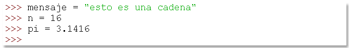 Este ejemplo crea tres asignaciones. La primera le asigna una cadena a una nueva variable llamada mensaje; la segunda le asigna el entero 16 a n; la tercera le asigna el valor aproximado de π a pi.