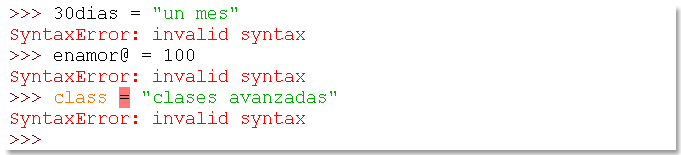 Si tienes un nombre de variable ilegal, obtendrás un error de sintaxis: