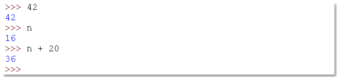 Cuando escribes una expresión en el prompt, el intérprete la evalua, esto significa que encuentra el valor de la expresión. En este ejemplo, n tiene el valor 17 y n + 25 tiene el valor 42.