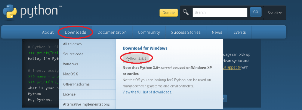 Para poder empezar tenemos que descargar Python, esto es muy sencillo, accedemos a la página oficial http://www.python.org y damos click en la pestaña «Downloads» y luego en el botón que dice «Python 3.8.1». Este número puede variar ya que siguen saliendo nuevas versiones del lenguaje cada cierto tiempo.