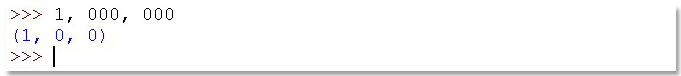 Cuando escribas un entero grande, puedes estar tentado a usar comas entre grupos de dígitos, como 1, 000, 000. Este no es un entero legal en Python, pero es legal: